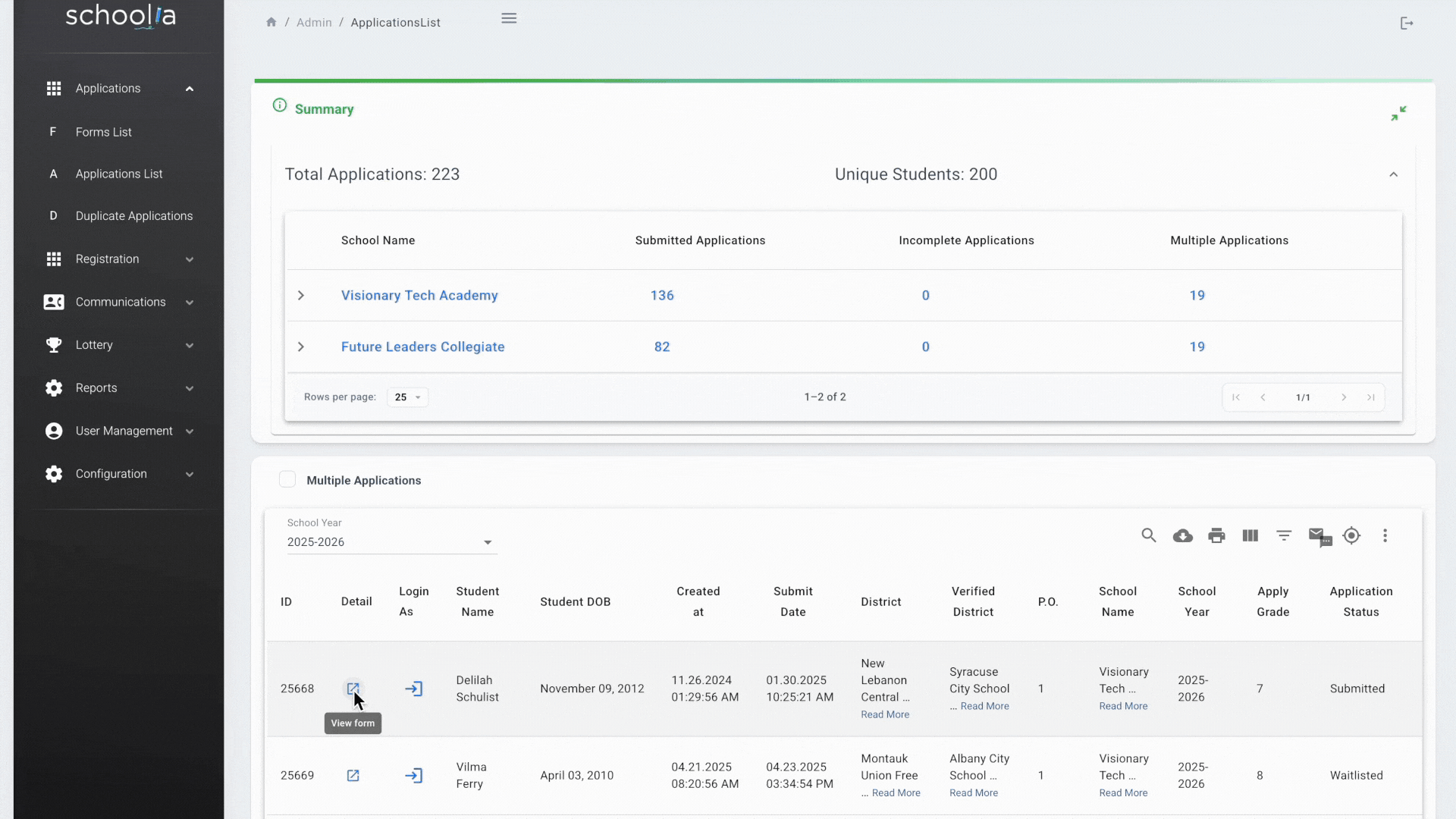 Schoolia has been a game-changer for our district’s enrollment management. Its flexibility allows each school to set up and manage unique policies, forms, and workflows that reflect their specific needs. We especially appreciate how the system supports different priorities and lottery weights for each school. Document management is intuitive and efficient, making it easy for both staff and families to stay organized. Most importantly, the platform has proven to be an effective communication tool, allowing us to keep families informed every step of the way. Schoolia has streamlined our enrollment process and improved our connection with the community.
